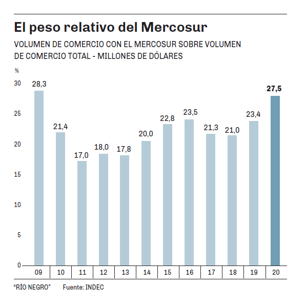 La estadística también se encarga de certificarlo. El tercer gráfico que acompaña la nota muestra el volumen de comercio argentino con el Mercosur, en proporción al volumen de comercio total entre 2009 y 2020. Nunca en la última década, el peso relativo del comercio con el Mercosur superó el 28%.