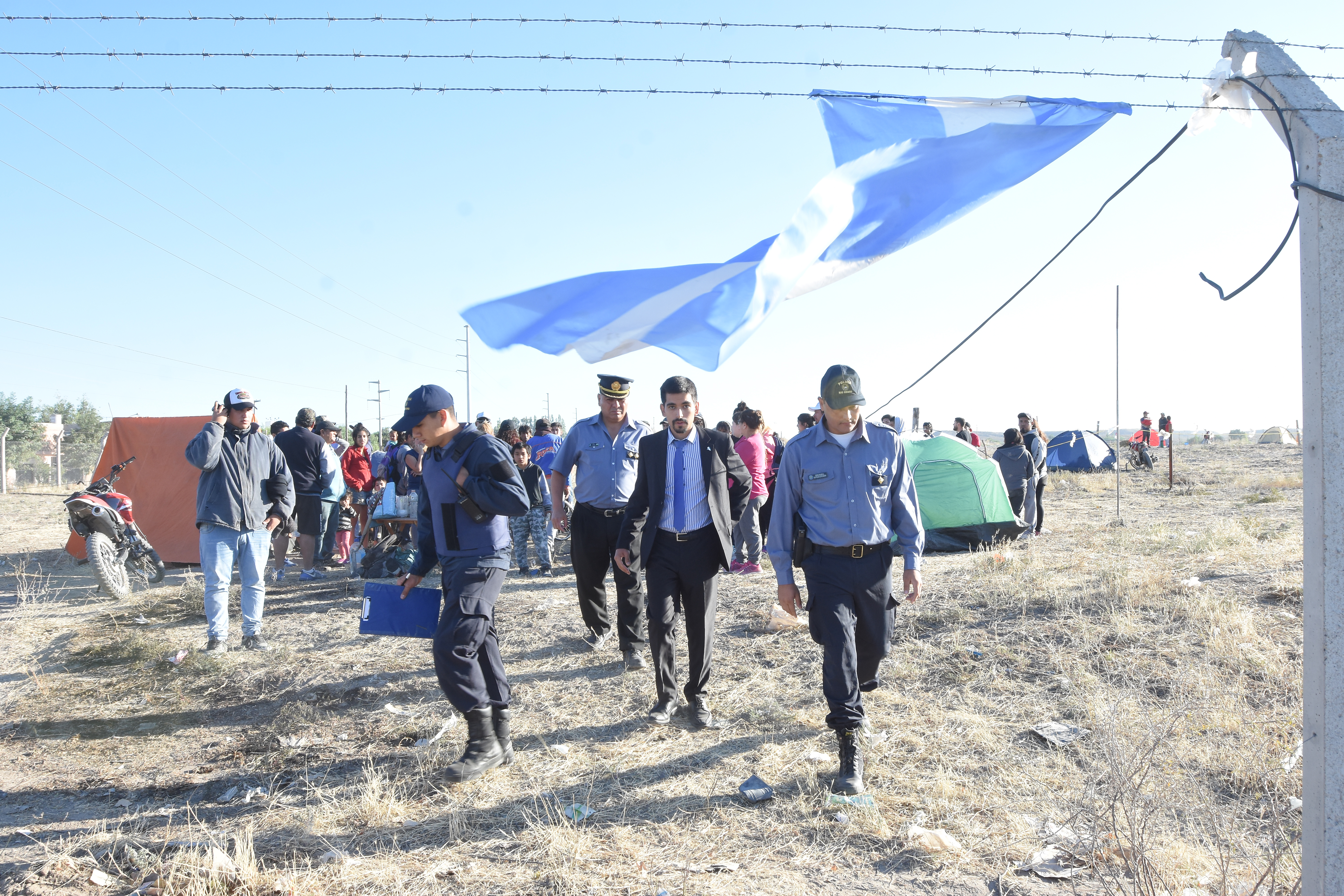 Desde la una de la tarde una docena de empleados municipales, custodiados por efectivos de la policía de Río Negro, comenzaron a colocar vallas rodeando los terrenos ocupados por unas 90 familias. La toma comenzó el domingo por la tarde, cuando varias personas ingresaron al predio que pertenecía al Servicio Penitenciario Federal (SPF), pero que fueron cedidas al municipio para la construcción de viviendas que nunca se culminaron.