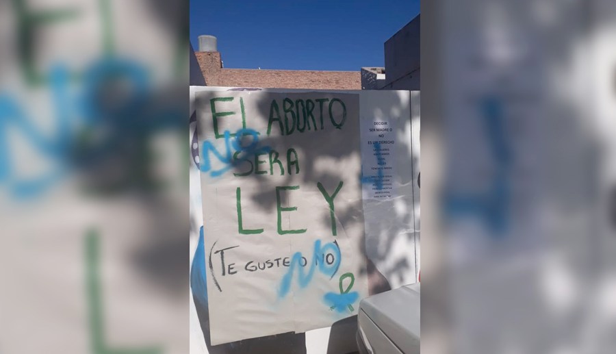 El mural que había sido blanco de un acto vandálico el 27 de noviembre, fue tapado por un papel madera con el lema “El aborto será ley (te guste o no)”, esa estructura fue vandalizada con aerosol celeste con la escritura “no”, un pañuelo celeste sobre el símbolo del aborto legal y tapó un cartel. El cartel dice: «Decidir ser madre o no es un derecho, las mujeres abortamos juntas, no les tenemos miedo. Educación sexual para decidir, anticonceptivos para no abortar y aborto legal para no morir».