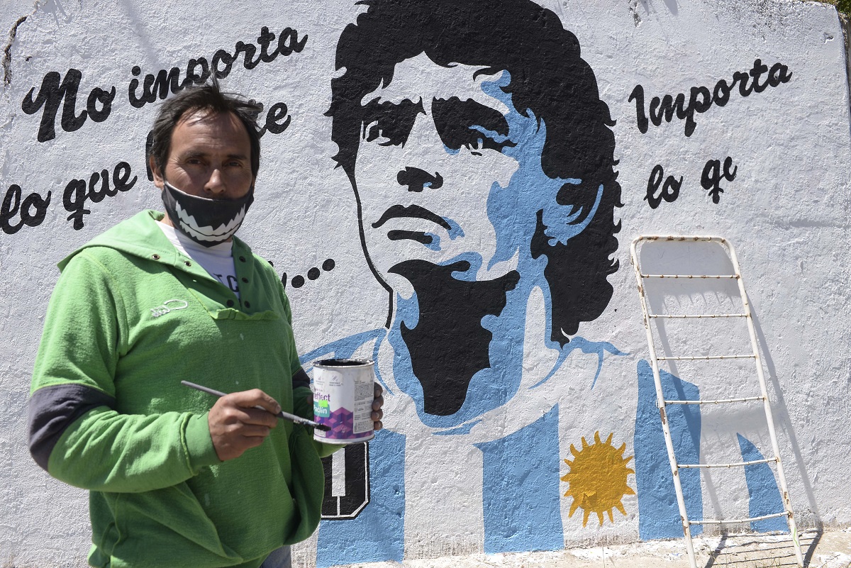 El retrato de Diego Maradona llegó esta semana a pedido. Carlos vive a pocos metros del paredón que pintó, en esa esquina transitada del barrio 3 de Mayo, y allí los propietarios de un complejo de canchas de fútbol sintético le propusieron hacer un homenaje al 10 a pocos días de su muerte. De inmediato Carlos se puso en la tarea de buscar imágenes icónicas del futbolista en internet, seleccionó algunas y la imagen final la eligieron los clientes.