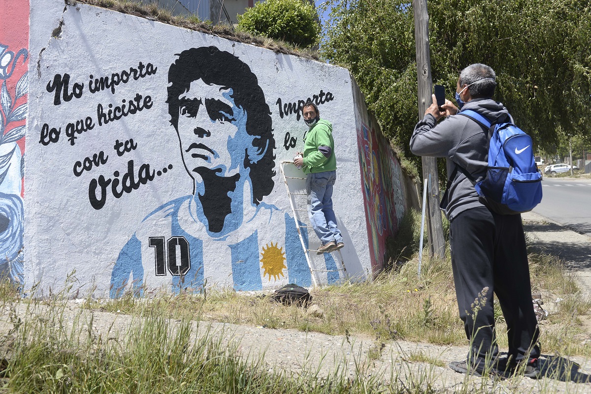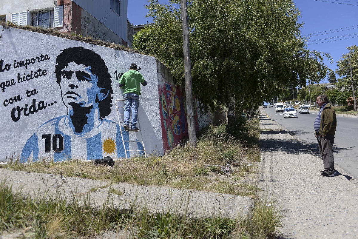Diego Armando Maradona es un ícono mundial. Es rock, ska y cuarteto. Su imagen se traduce en remeras, camisetas, banderas, gorras y tatuajes en la piel, pero además forma parte de una repetición paredes que lo inmortalizan desde el día de su partida y en Bariloche su rostro quedó plasmado en la esquina de Bestchedt y Mascardi.