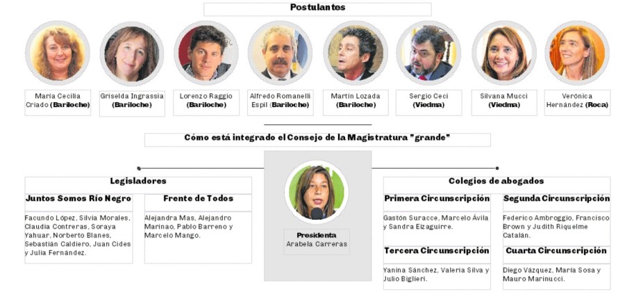 Miércoles 30 a las 9, en Viedma. Eso indica la formalidad de la convocatoria para los ocho candidatos -cuatro mujeres y cuatro hombres- como también para los 24 consejeros -12 legisladores y 12 representantes de los colegios de abogados- que acompañarán a la gobernadora, Arabela Carreras, quien presidirá la sesión.