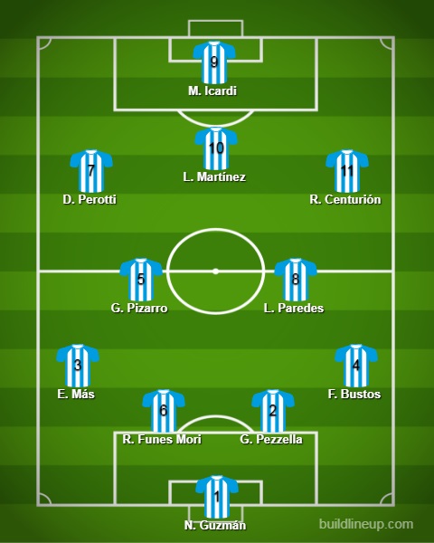Tres puntas, tres habilidosos, tres goleadores. El habitual desequilibrio argento, con el plus de la llegada al arco contrario. Centurión, pura gambeta y generación. Lautaro, por detrás del 9, para aportar una opción más en el área. Y Perotti, para ganar juego en las bandas y crearle ocasiones a los compañeros.