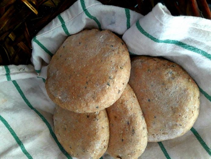 El pan que hago en casa lleva algo así como 1 cda grande de levadura fresca en cuenquito con agua tibia. Luego le agrego semillas que tengas (lino, chia, sésamo). Lo dejo que active, que espume, ese aroma me provoca. En otro bowls incorporo un kilo de harina integral y pizca de sal. Incorporo después 2 1/2 tazas de agua tibia, 3 cucharadas de aceite y la mezcla de levadura y semillas. Amaso tranqui hasta que todo queda incorporado.