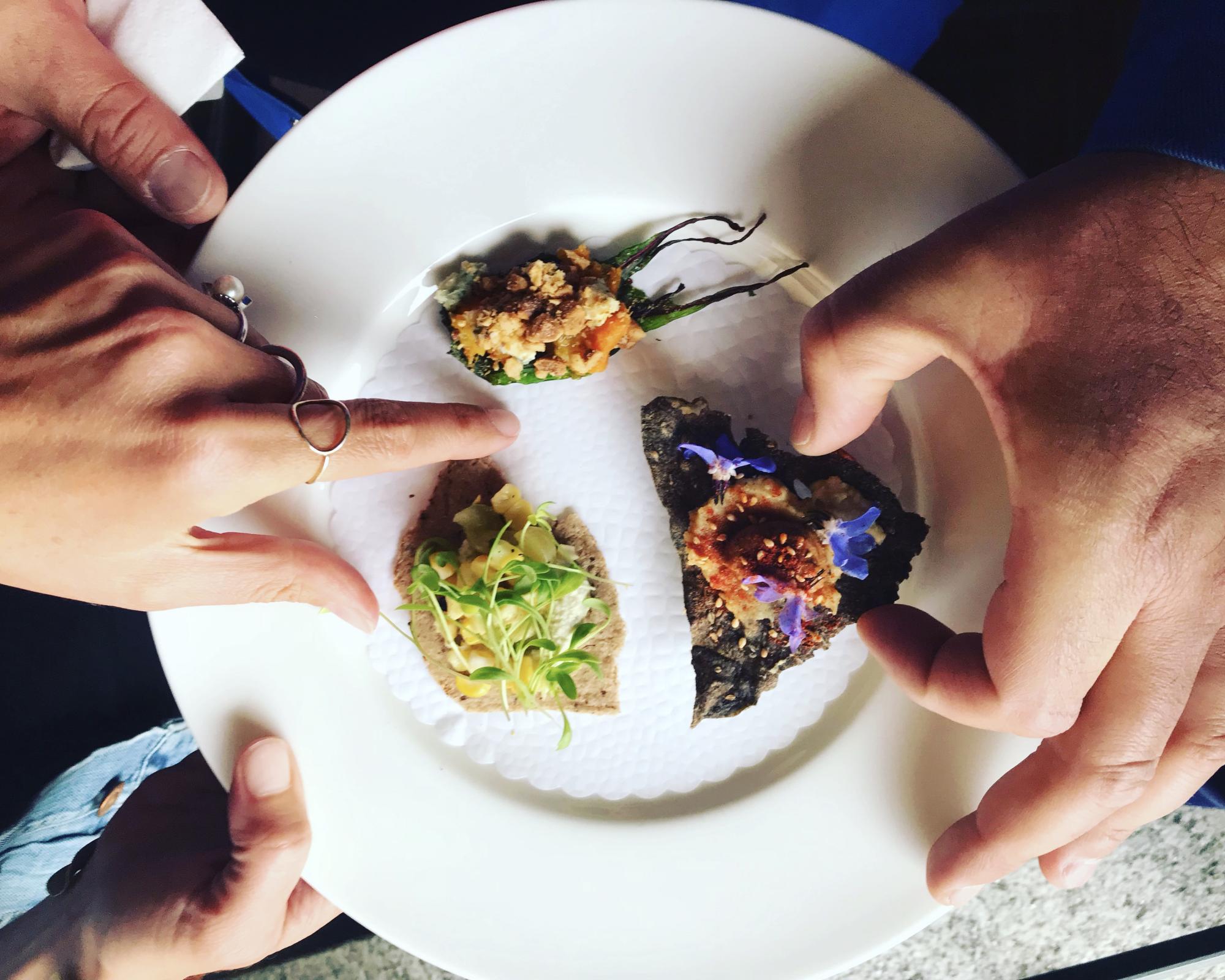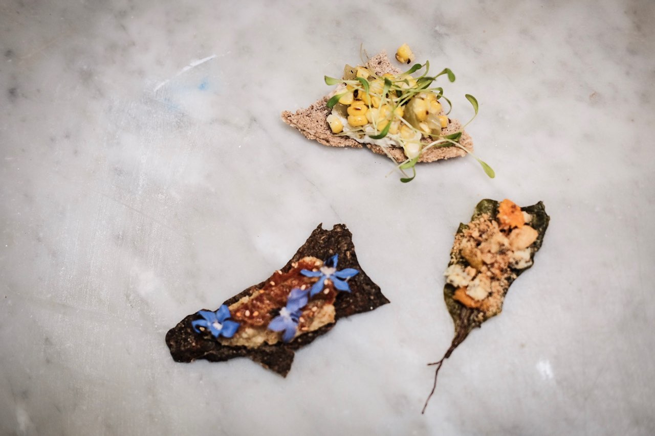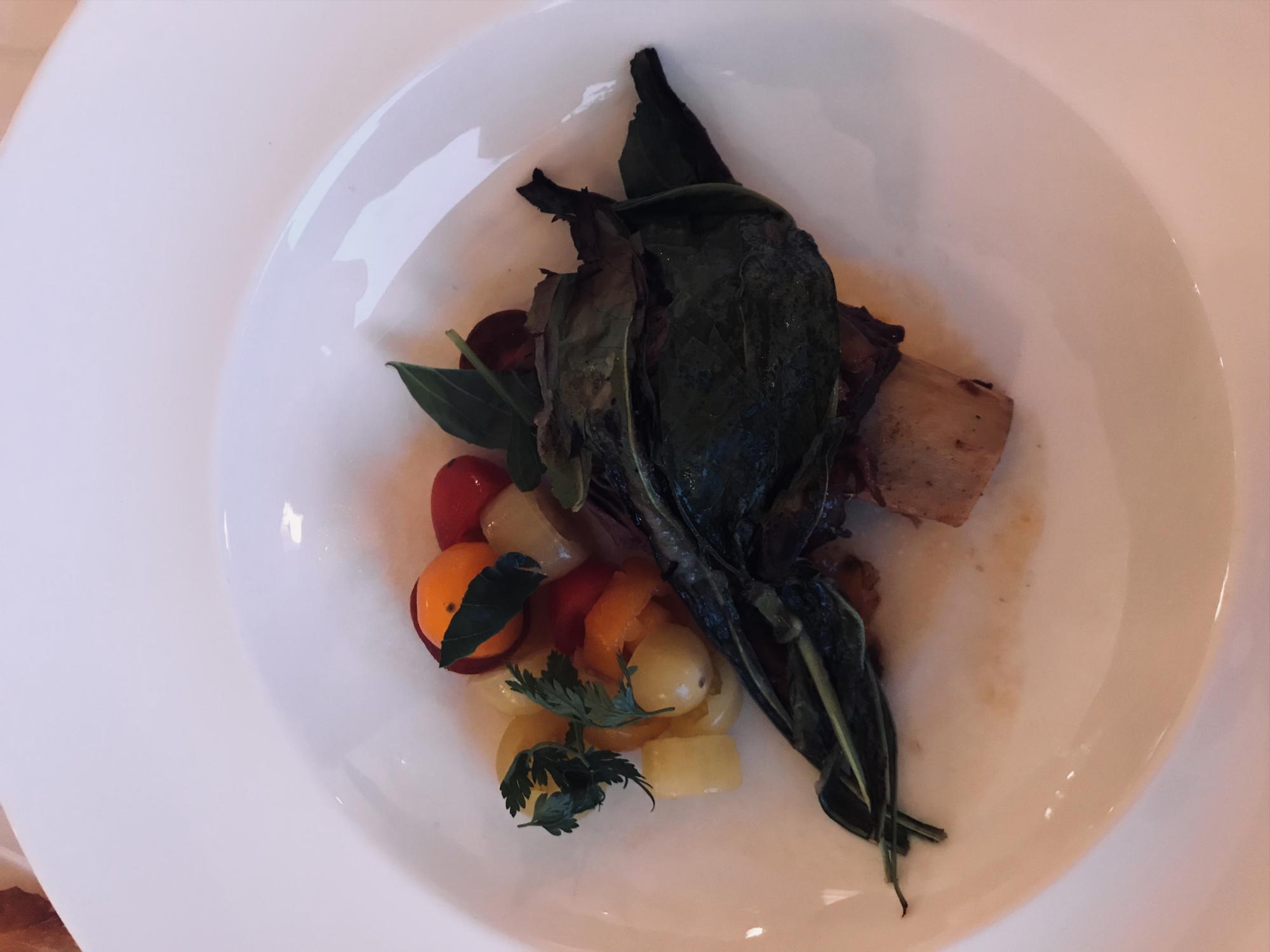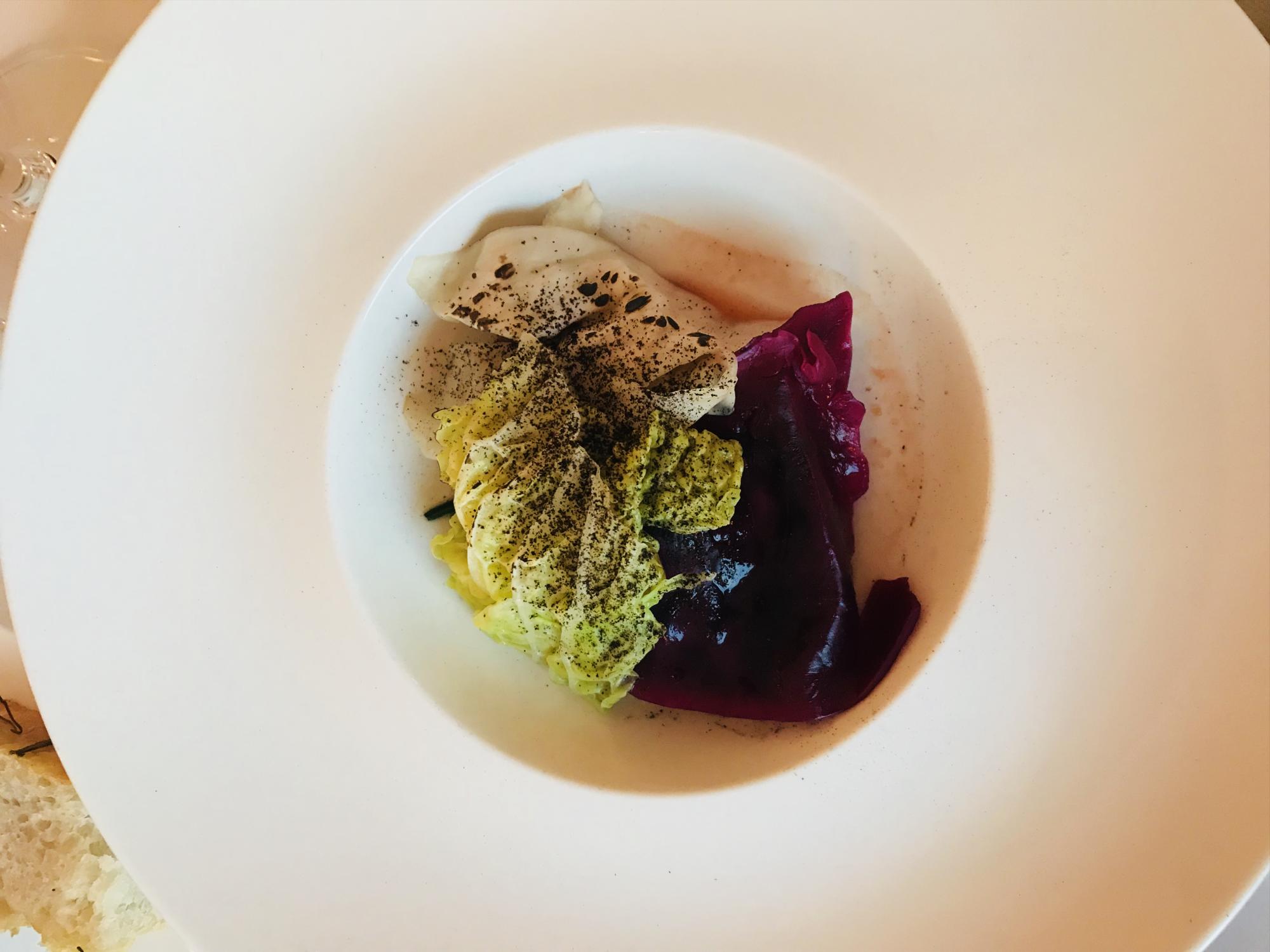 El menú de Leo se sirvió en un salón con una vista privilegiada al Lago Maggiore en el Hotel Villa Orselina, un cinco estrellas de la suiza italiana en la región de Ticino. El contraste de la cocina extrovertida de Lanussol fue una melodía afinada sobre el casi quieto campo de flores de colores del lugar increíble en el que estábamos. Delicioso menú que arrancó con una tanda de abrebocas interesantes. Una galleta de anís negra con mole de semillas y flores, bien vegana. Otro de castañas de caja, choclo quemado, uvas y berro. Y el último sobre una hoja de kale una pincelada de batata naranja, avellanas crocantes y patagonzola.