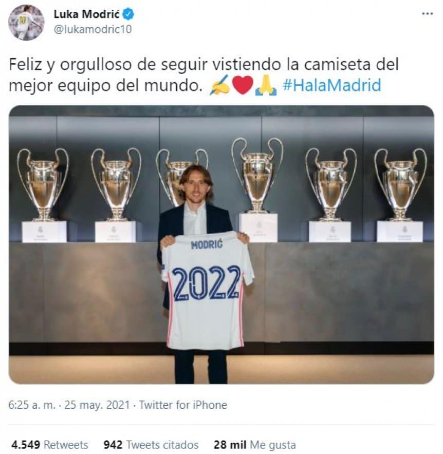 “Real Madrid y Luka Modric acordaron la ampliación de su contrato hasta el 30 de junio de 2022”, anunció el club más ganador de España y de Europa en un comunicado oficial, que luego fue ratificado por el propio jugador a través de sus redes sociales.