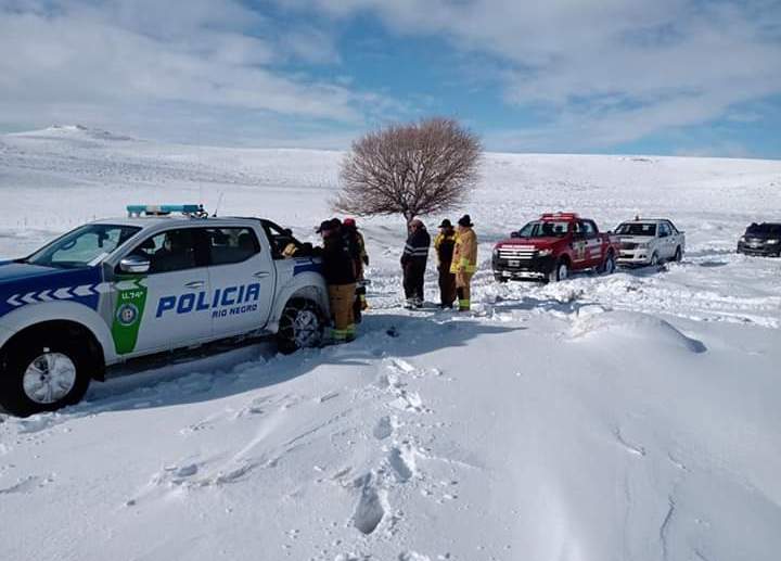 Un móvil policial doble tracción de la Subcomisaría 74 de Comallo facilitó el acceso de los efectivos policiales pese a las condiciones adversas y las dificultades en el terreno ya que la nieve acumulaba varios centímetros.