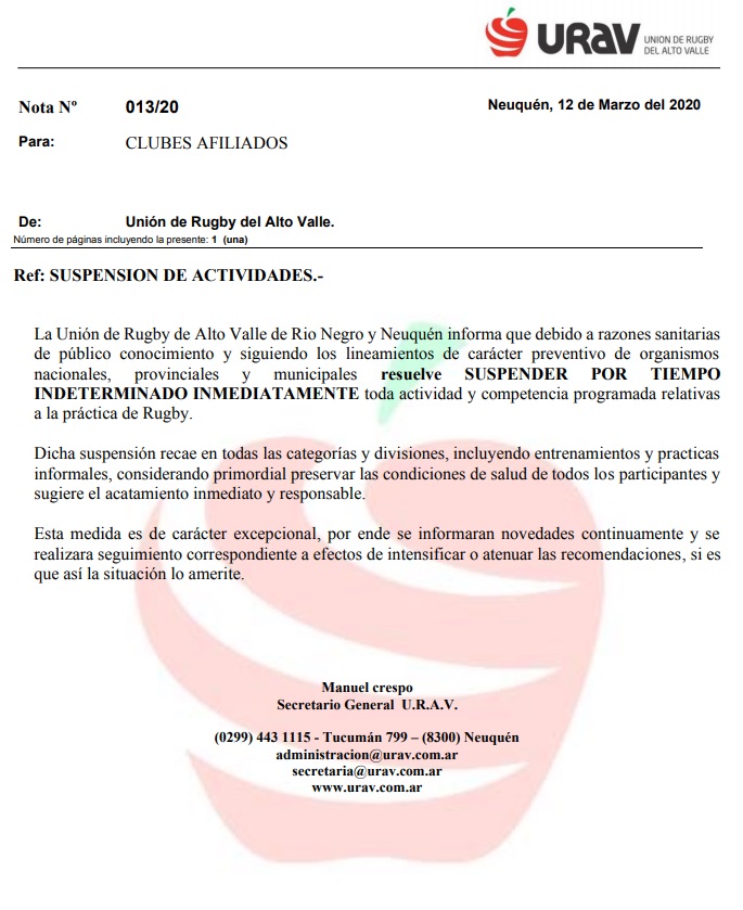 La Unión de Rugby del Alto Valle de Río Negro y Neuquén (URAV) resolvió suspender por tiempo indeterminado toda la actividad y competencia que había sido programada.