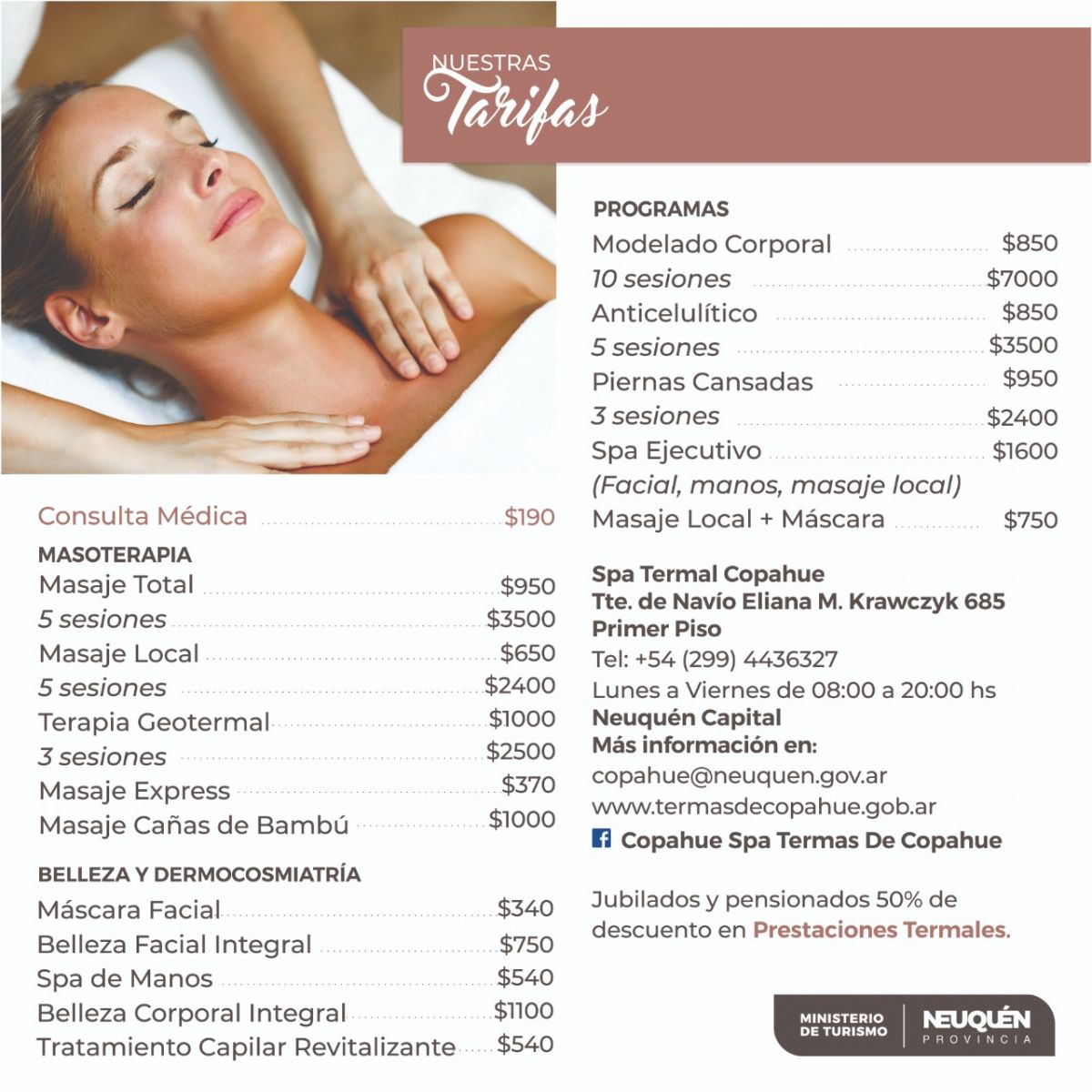 El nuevo spa se ubica en el Paseo de la Costa, en el primer piso del edificio ubicado sobre la calle Teniente de navío Eliana M. Krawczyk 685, de 8 a 20, en horario corrido. Para hacer consultas o solicitar turnos hay que comunicarse a los teléfonos 0299) 4424140 o 4098783.