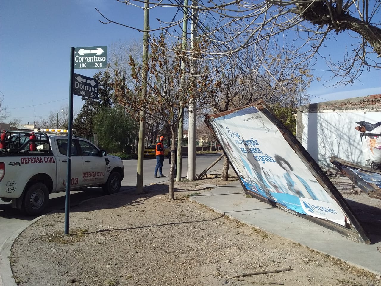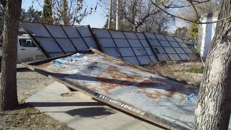 Baggio indicó que un cartel pequeño de la heladería del centro cayó sobre la calle Ministro González. El letrero indicador ya fue retirado del lugar sin ocasionar lesiones ni otros daños materiales. Otros letreros callejeros cedieron ante la fuerza del viento sobre la esquina de calle Correntoso y Domuyo.