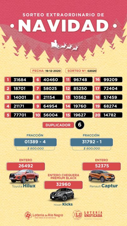 Para quienes quieran corroborar su suerte los resultados están disponibles en la página web de Lotería de Río Negro www.loteriaderionegro.gob.ar y en la redes sociales.