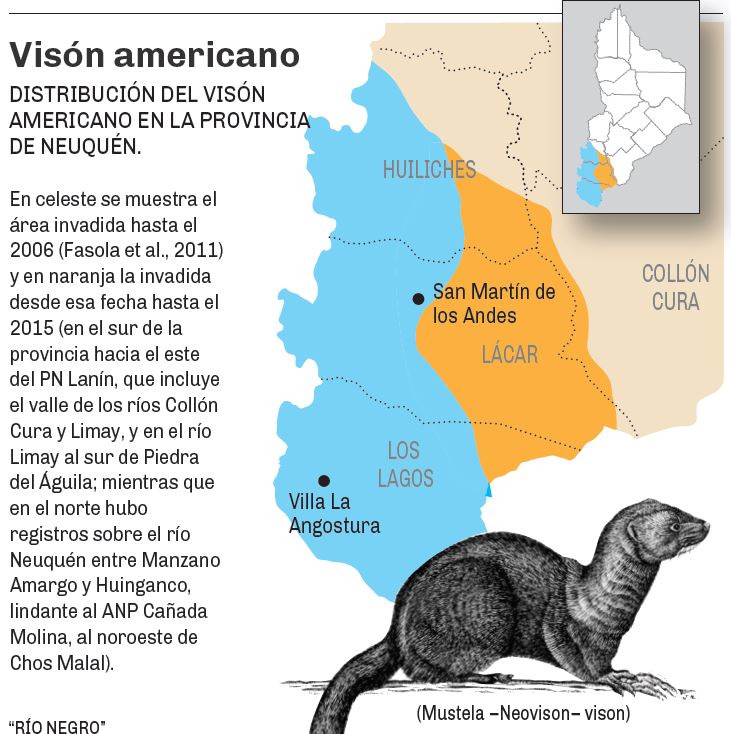 En 1990 los visones desembarcaron al sur del Parque Nacional Lanín. Llegaron a la cuenca del río Malleo en 2010; y en enero de este año se observaron los primeros en Aluminé. Según el biólogo pueden llegar hasta el Limay.
