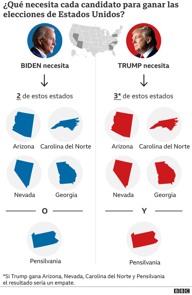 Arizona, Georgia, Pensilvania, Nevada y Carolina del Norte tienen la llave de la Casa Blanca. Biden lidera en los principales, pero todavía quedan horas de recuento.