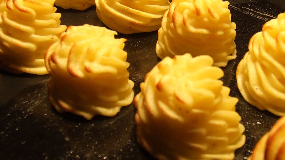 Enmantecar un molde o bandeja. Verter el puré dentro de una manga de repostería. Rellenarla unas 3/4 partes con la mezcla. Entonces armar las papas duquesas en forma de escarapela redonda o roseta.
