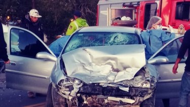 El impacto se produjo casi de manera frontal entre un Chrevrolet Corsa y una Renault Kangoo, cuando uno de los rodados intentaba ascender y el otro rodado circulaba por la vía nacional. En el auto iba la conductora con un nene de 9 años que fueron quienes debieron ser retirados con la colaboración de los bomberos voluntarios, quienes cortaron una de las puertas.
