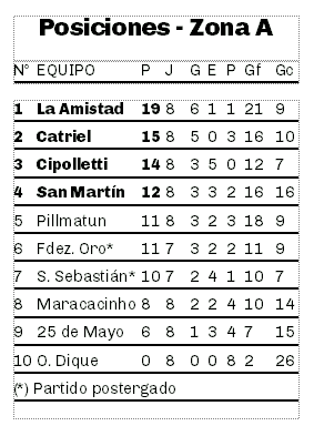 Por La Zona A, en tanto, Catriel derrotó como local 2-1 a San Martín y aseguró su boleto a los cuartos de final.