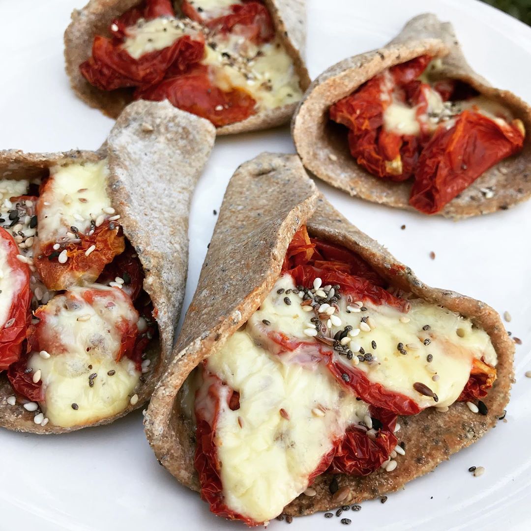 Por otro lado, hidratar los tomates. Armar nuestras empanadas con los tomates, albahaca y queso. Podés esparcir más semillas. Llevar a horno moderado por 30 minutos (depende de cada horno).