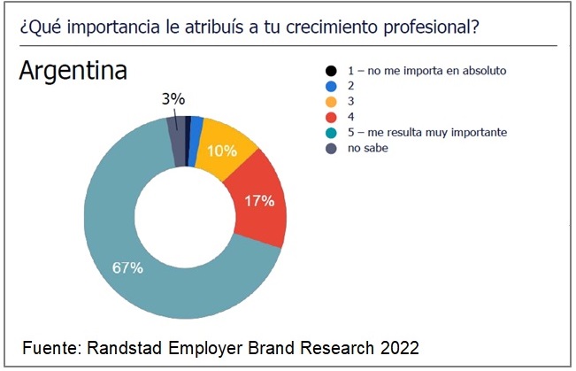 El 84% de los trabajadores argentinos considera fundamental la posibilidad de desarrollo profesional en su trabajo. Y, aunque el crecimiento profesional es considerado importante por todas las personas, resulta especialmente más importante para quienes tienen entre 25 y 34 años (88%) y para las personas con estudios universitarios o superiores (87%).