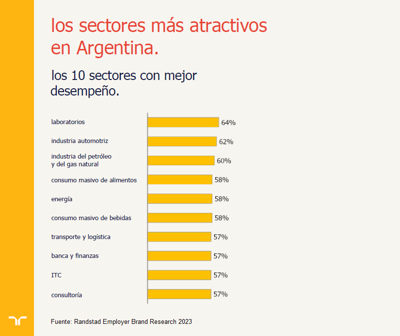 Completan el top 10 de los sectores más atractivos elegidos por los argentinos para trabajar la industria del petróleo y del gas natural (60%); consumo masivo de alimentos (58%); energía (58%); consumo masivo de bebidas (58%); transporte y logística (57%); banca y finanzas (57%); Tecnología de la Información y las Comunicaciones –ITC- (57%) y consultoría (57%), siendo los sectores que lograron este año la mejor performance entre nivel de conocimiento y nivel de atractivo de los empleadores.