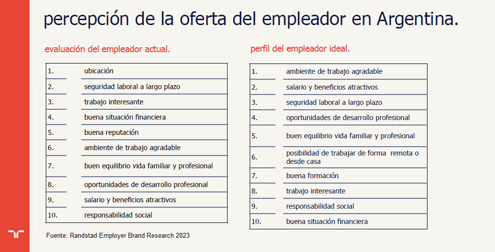 En el mismo sentido, los restantes factores del top 5 se encuentran relegados cuando se trata de la percepción de atributos que ofrecen los empleadores, dado que salario y beneficios está en el noveno lugar, oportunidades de desarrollo profesional en el octavo y equilibrio entre vida profesional y familiar en el séptimo.