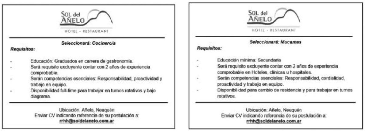 Hotel y Restaurant Sol del Añelo rrhh@soldelanelo.com.ar. Seleccionara Cocineras / Cocineros y Mucamas / Mucamos