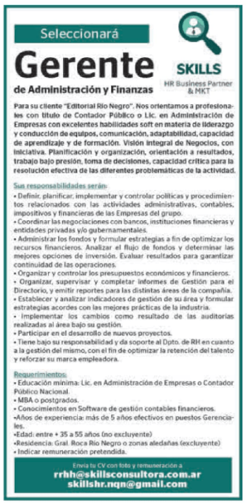 Skills para Editorial Rio Negro busca Gerente de Administración y Finanzas