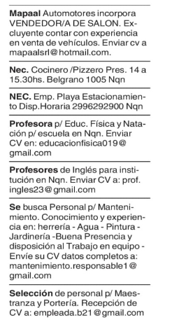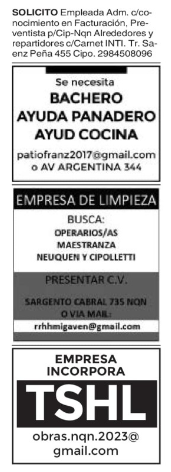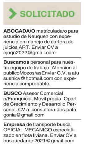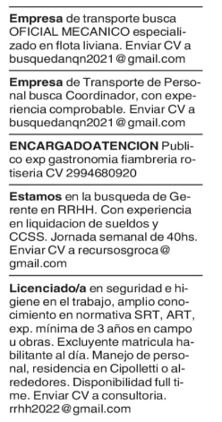 Presentamos un listado de las ofertas laborales más recientes con foco en Neuquén, Rio Negro y Patagonia norte. Podes ver mas detalles en nuestros clasificados.