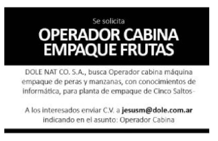 Dole Nat CO busca operador de cabina para galpón de empaque: