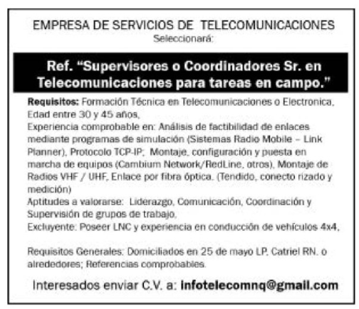 Empresa de servicios de Telecomunicaciones busca: Supervisores o coordinadores Sr. en telecomunicaciones para tareas de campo