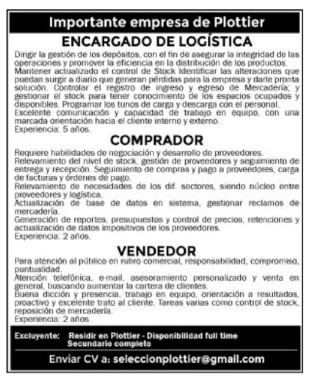 Importante empresa de la región busca: (Enviar CV a rhumanos.seleccion.2019@gmail.com)