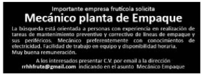 Importante empresa Frutícola solicita Mecánico de Empaque