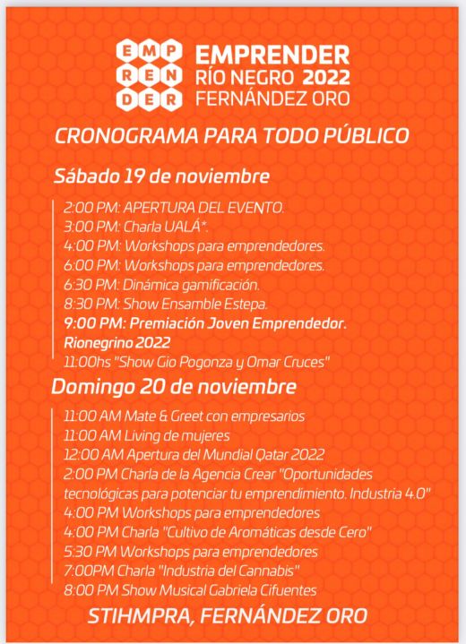 El evento incluirá todo tipo de actividades informativas, recreativas y culturales, buscando potenciar cada negocio. En esta edición, las jornadas se desarrollarán de manera presencial y online. Además, se realizará la entrega del «Premio al joven Emprendedor rionegrino 2022», un espacio que convocará a los cien mejores proyectos de la provincia y que entregará reconocimientos en diez categorías.