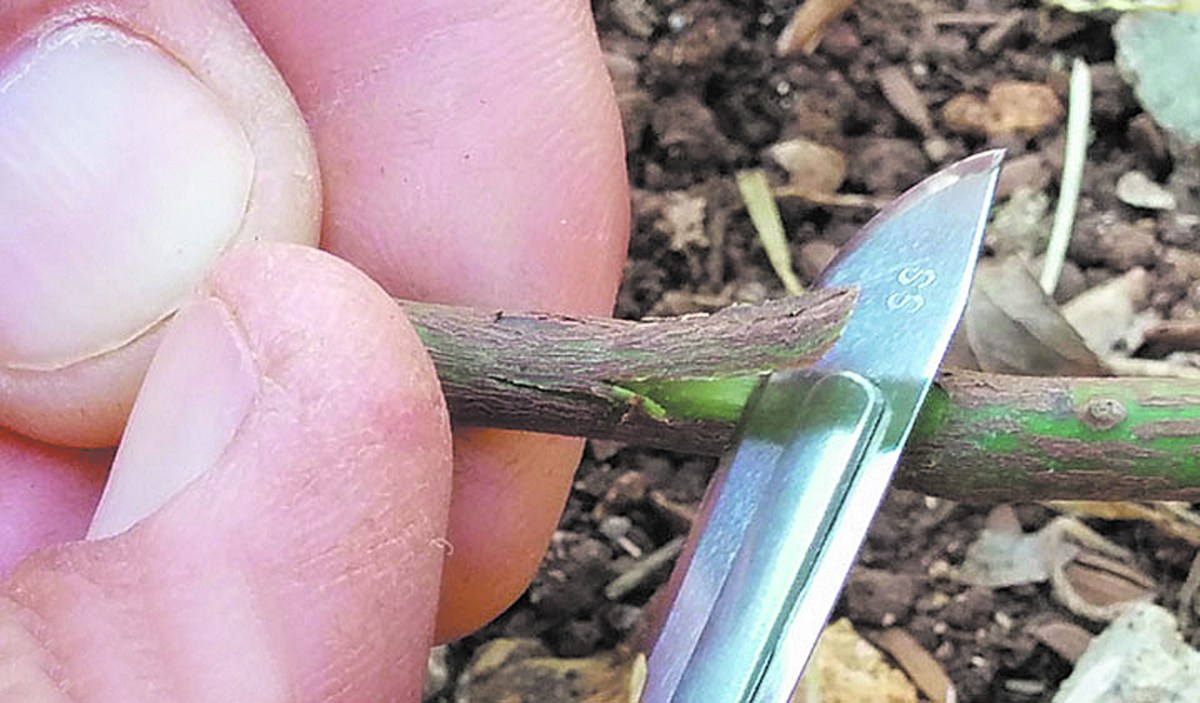 “En nuestra zona del Alto Valle de Río Negro y Neuquén, no es muy conveniente injertar en esta época”, indica Muñoz, ya que las heladas otoñales ocurren cuando los injertos están en crecimiento activo, aun sin lignificar completamente y los queman. En cuanto a las “técnicas de ejecución”, sobre un portainjerto de 0,5 a 2,5 centímetros de diámetro y a unos 10 a 15 centímetros del cuello, se realiza con la navaja, un corte transversal de aproximadamente 1 centímetro.