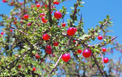 “El fruto es una drupa levemente alargada del tamaño de una arveja grande y color anaranjado rojizo, que se torna brillante en su madurez, muy dulce y comestible”, explica el experto, pero advierte sobre su cuidado al querer cosechar su fruta, ya que las espinas poseen una especie de telita que contiene tierra y restos vegetales y si nos pinchamos o clavamos una espina suele ser muy infecciosa causando hinchazón, dolor y temperatura en la zona afectada.