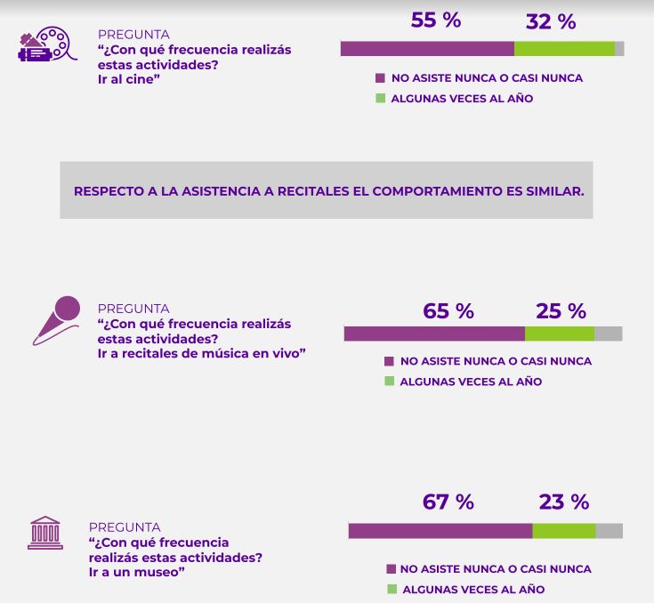 A la pregunta de si asisten a museos, recitales y cines, el 67% indicó que no va nunca o casi nunca a un museo; el 65% no fue a ningún recital y el 55% tampoco va al cine, cifra que sube al 75% si la consulta es sobre teatro, ópera o ballet. En este último tópico, la cifra se eleva al 82% en los jóvenes entre 15 y 24 años y disminuye al 68% en los mayores de 60.