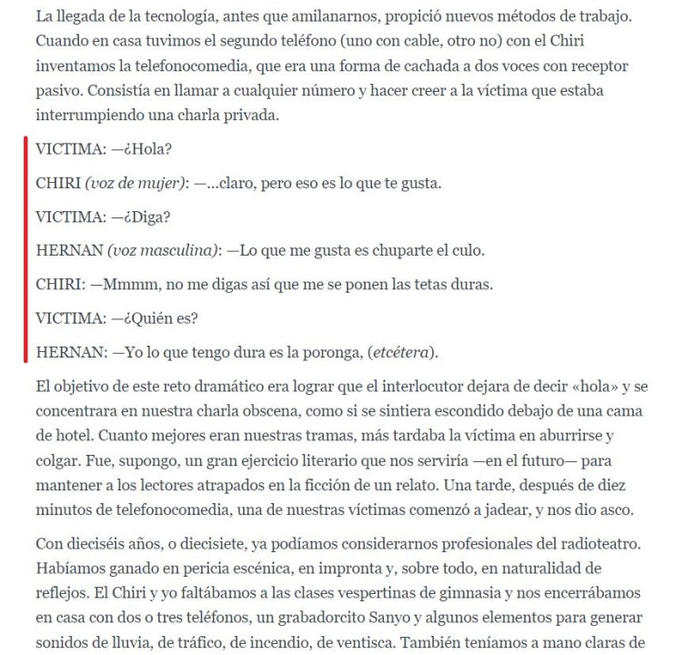En el pasaje que generó esta situación, Casciari relata una charla telefónica entre dos jóvenes varones, donde hacen una broma a otro interlocutor. En dicha broma, simulan una conversación con contenido sexual, con la intención de incomodar a la persona del otro lado de la línea. Es apenas un breve pasaje, un recuerdo del escritor, que da paso al resto de la historia. ¿A qué se debe el escándalo? A que en ese pasaje telefónico, se mencionan las palabras “culo”, “teta” y “poronga”.
