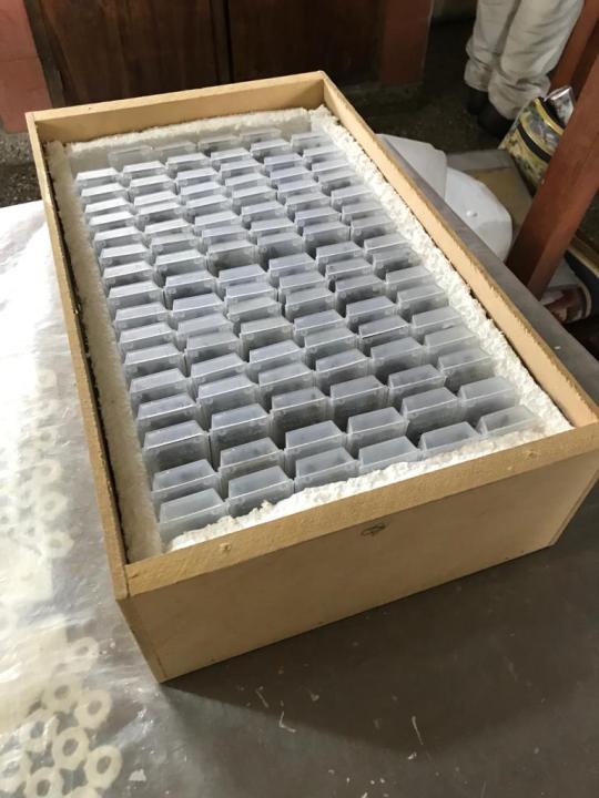 “Para que viajen en buenas condiciones y lleguen bien, las embalamos. Van dentro de sus jaulitas, en una caja con requerimientos de exportación. Dentro de la caja tienen ventilación y un centímetro de telgopor para que no se enfríen. También van con agua para hidratarse. Están embaladas de modo que llegan perfectamente bien, y las acompañantes le aportan calor a la reina”, agrega.