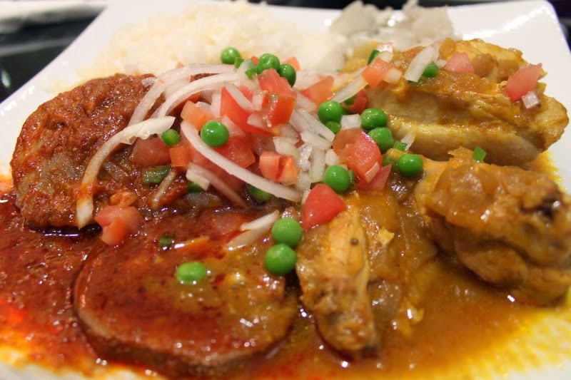 El picante de pollo lleva como acompañamiento arroz o fideos, unas papitas que son del norte que nosotros le decimos chuño, y la papa blanca de acá, bien hervida. Y arriba del pollo se sirve una ensalada de tomate, lechuga, también tiene arvejas y perejil, que equilibra con el picante de la cebolla y el ají.