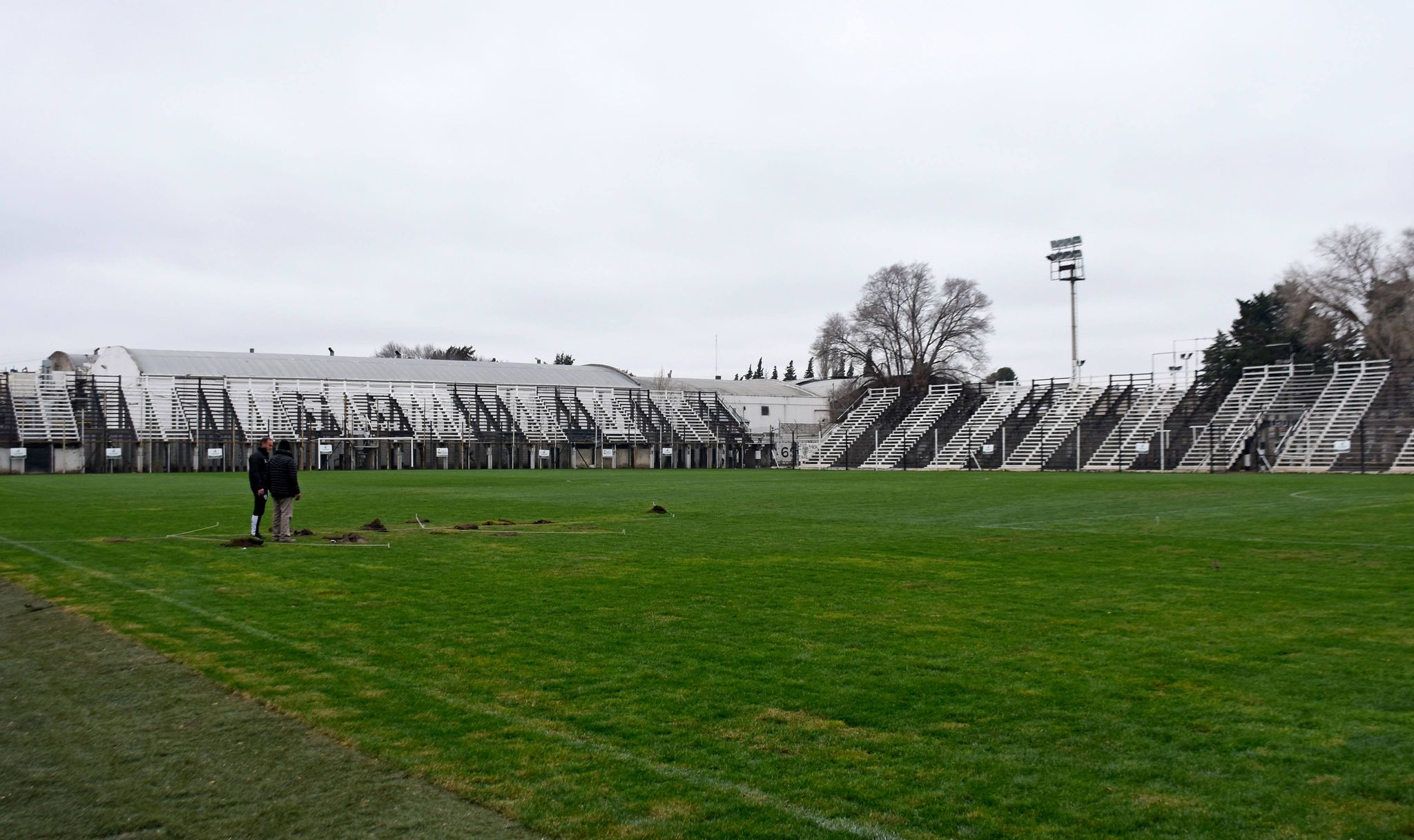 “La cancha viene bien, el pasto está bárbaro. Tocaron días malos, ayer salió el sol y subió un poco la temperatura después de 15 días”, explicó Luciano Fernández Carro, ingeniero de La Deseada, empresa a cargo de los trabajos en La Visera.