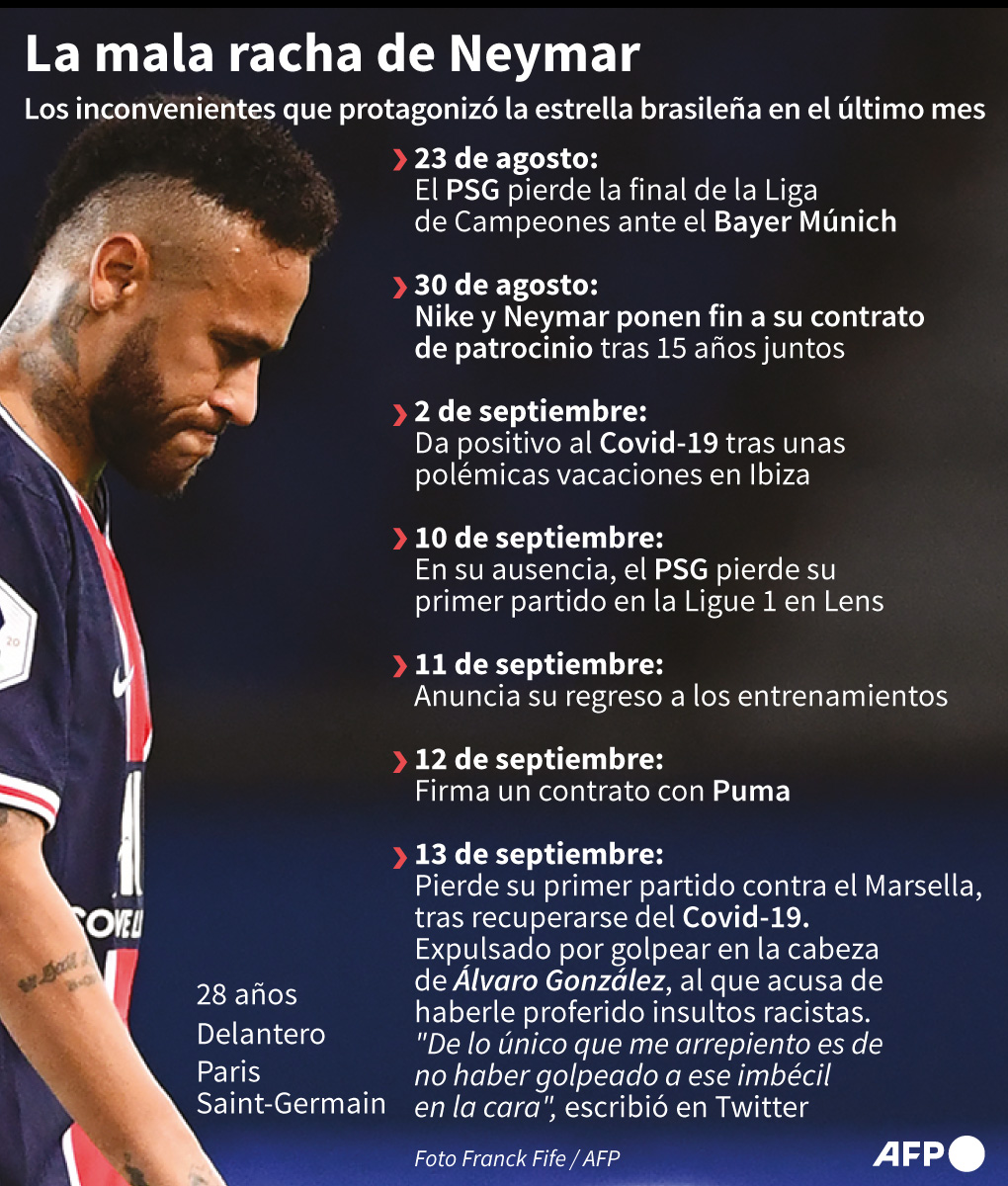 El París SG apoyó el reclamo de su jugador estrella Neymar que afirma haber sido víctima de insultos racistas el domingo durante el clásico que el equipo parisino perdió en casa (1-0) contra el Olympique Marsella.