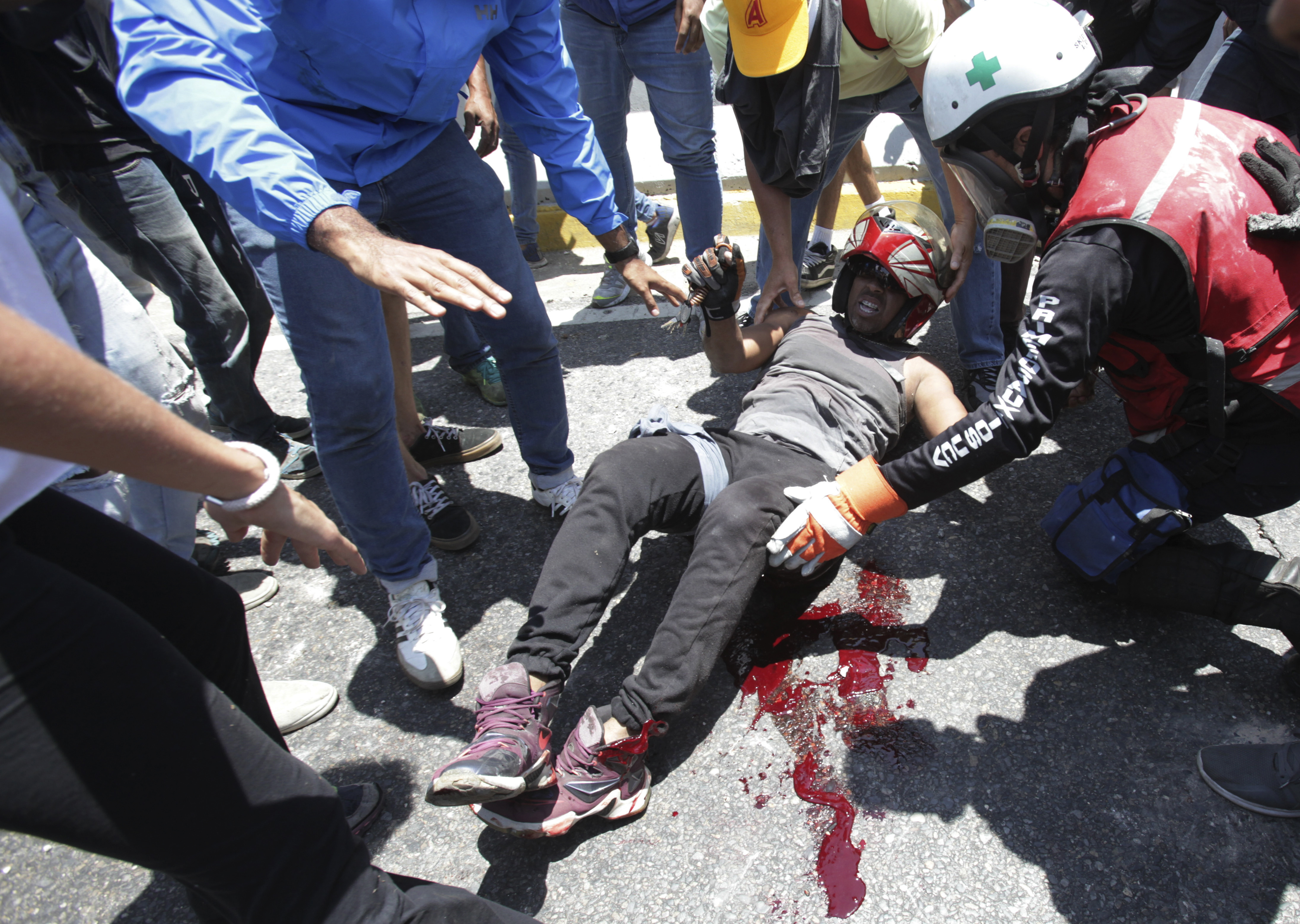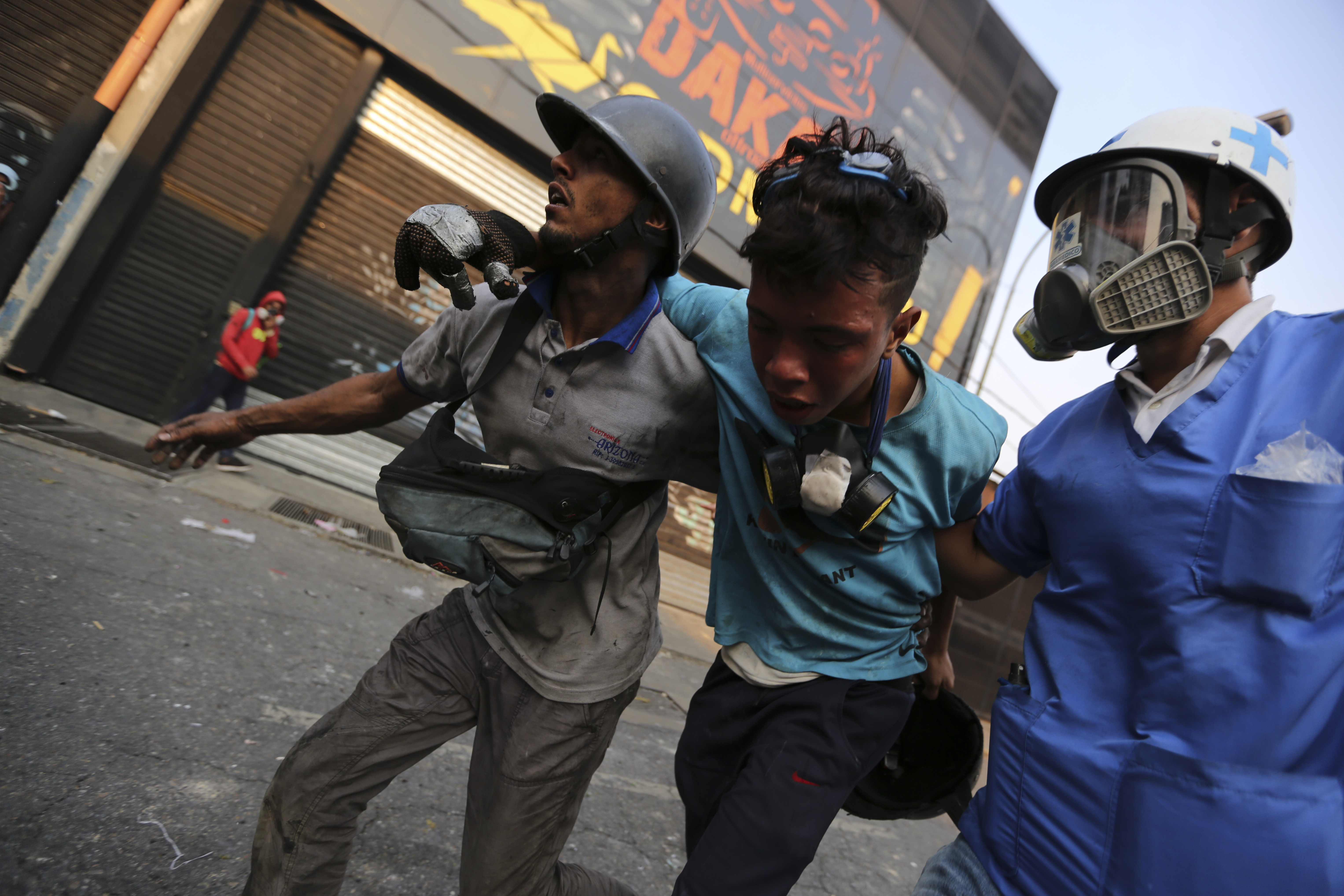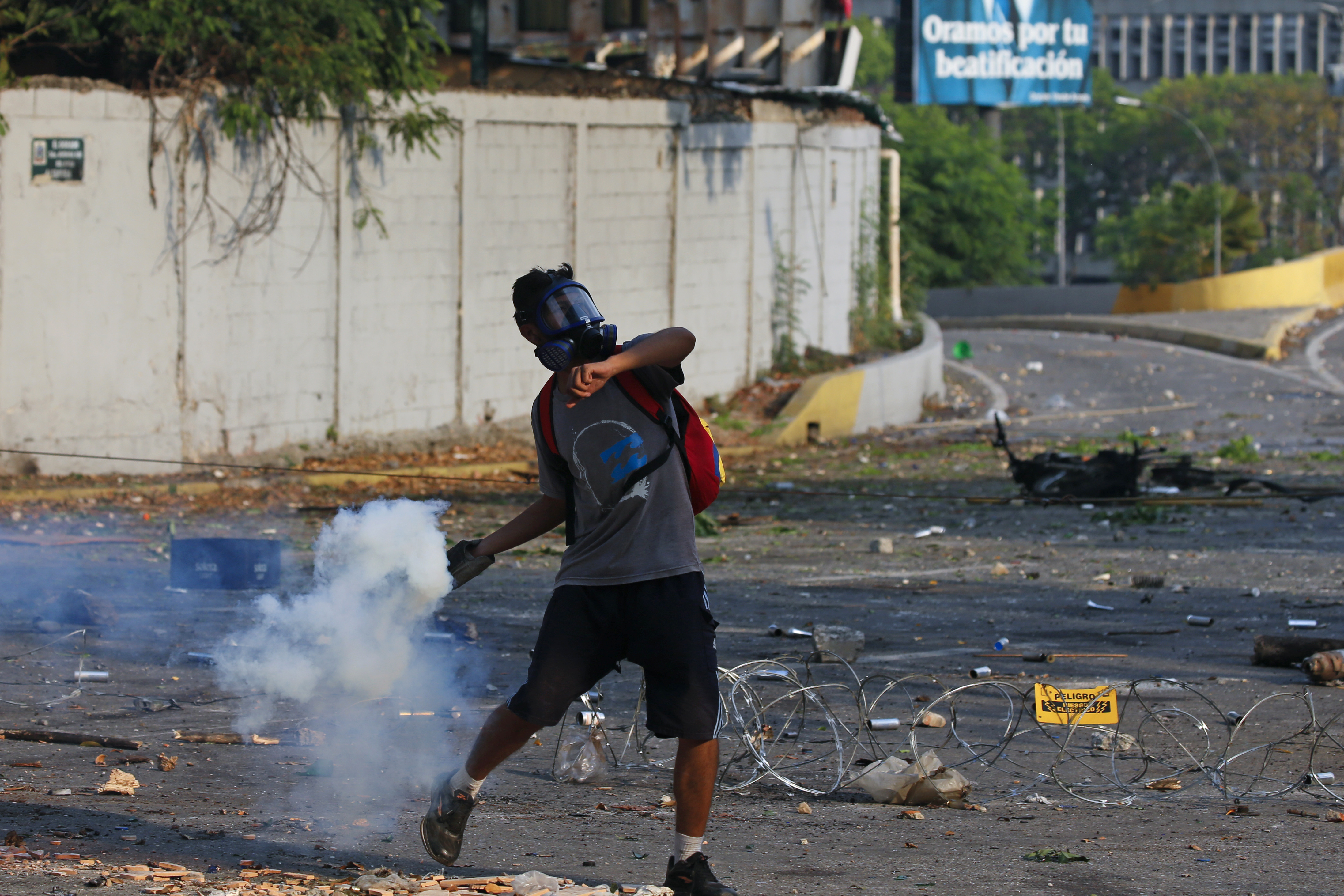 Un adversario del presidente venezolano Nicolás Maduro que lleva una bandera venezolana se cubre la cara en medio de gases lacrimógenos disparados por soldados leales al mandatario. (Foto: Boris Vergara / AP)