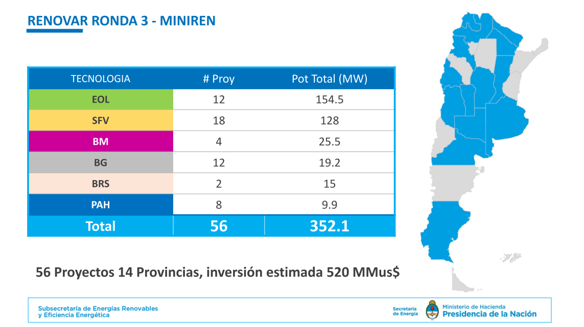 La secretaría de gobierno de Energía recibió ayer 56 ofertas de la Ronda 3 – MiniRen del programa RenovAr orientada a Pymes de todo el país. Una vez que se evalúen las ofertas se adjudicarán los proyectos y la fecha será el 22 de julio. Y la firma de contratos de abastecimiento de energía eléctrica con la Compañía Administradora del Mercado Mayorista Eléctrico (Cammesa) se agendó para el 29 de julio.