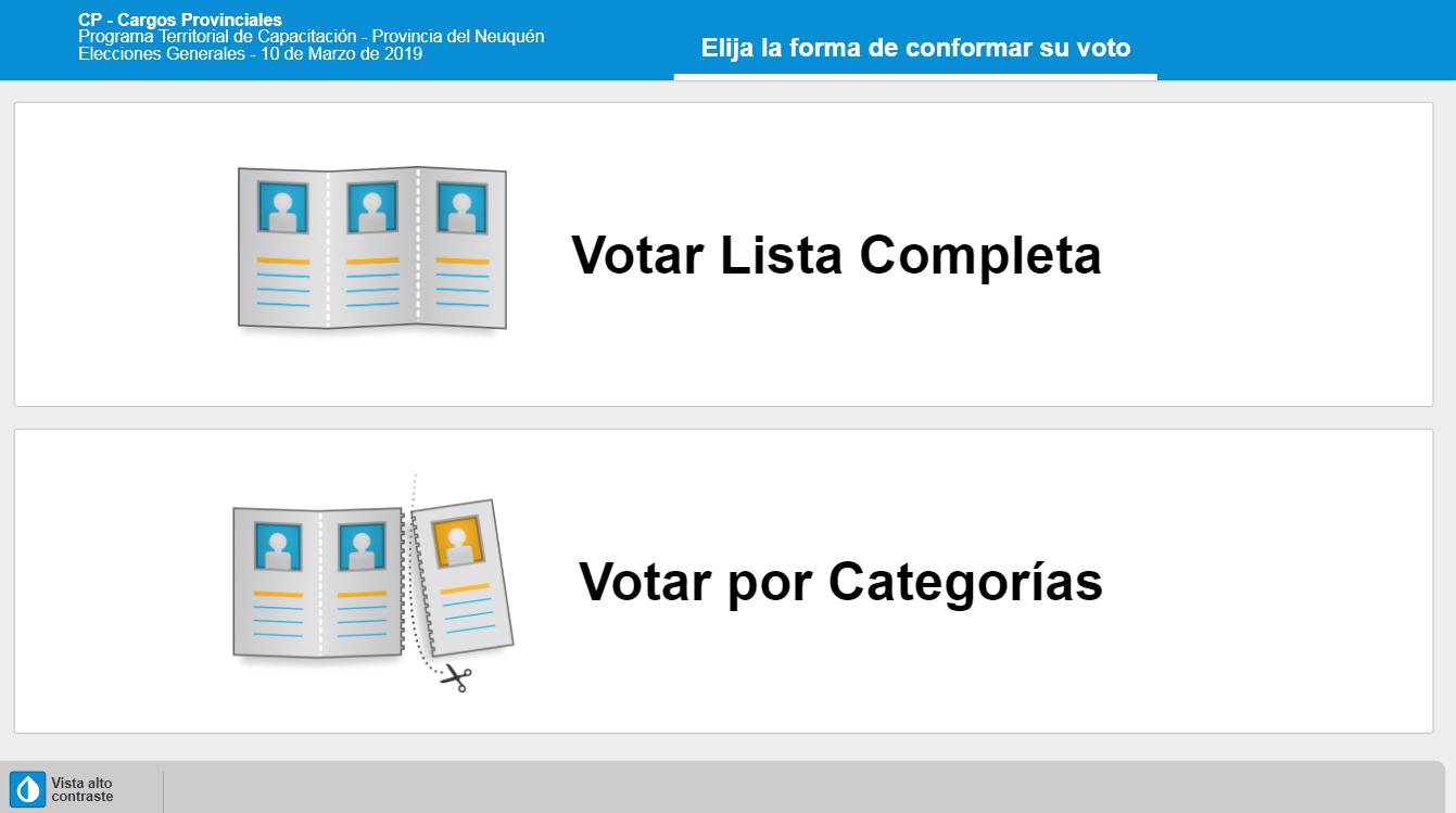 En las localidades que elijan cargos provinciales y municipales, la opción de elegir por categoría obligará a los electores a presionar la pantalla cinco veces para seleccionar a sus candidatos: gobernador, diputados, intendente, concejales y consejeros escolares. La pantalla permite también la opción de voto en blanco, pero en un casillero más pequeño.