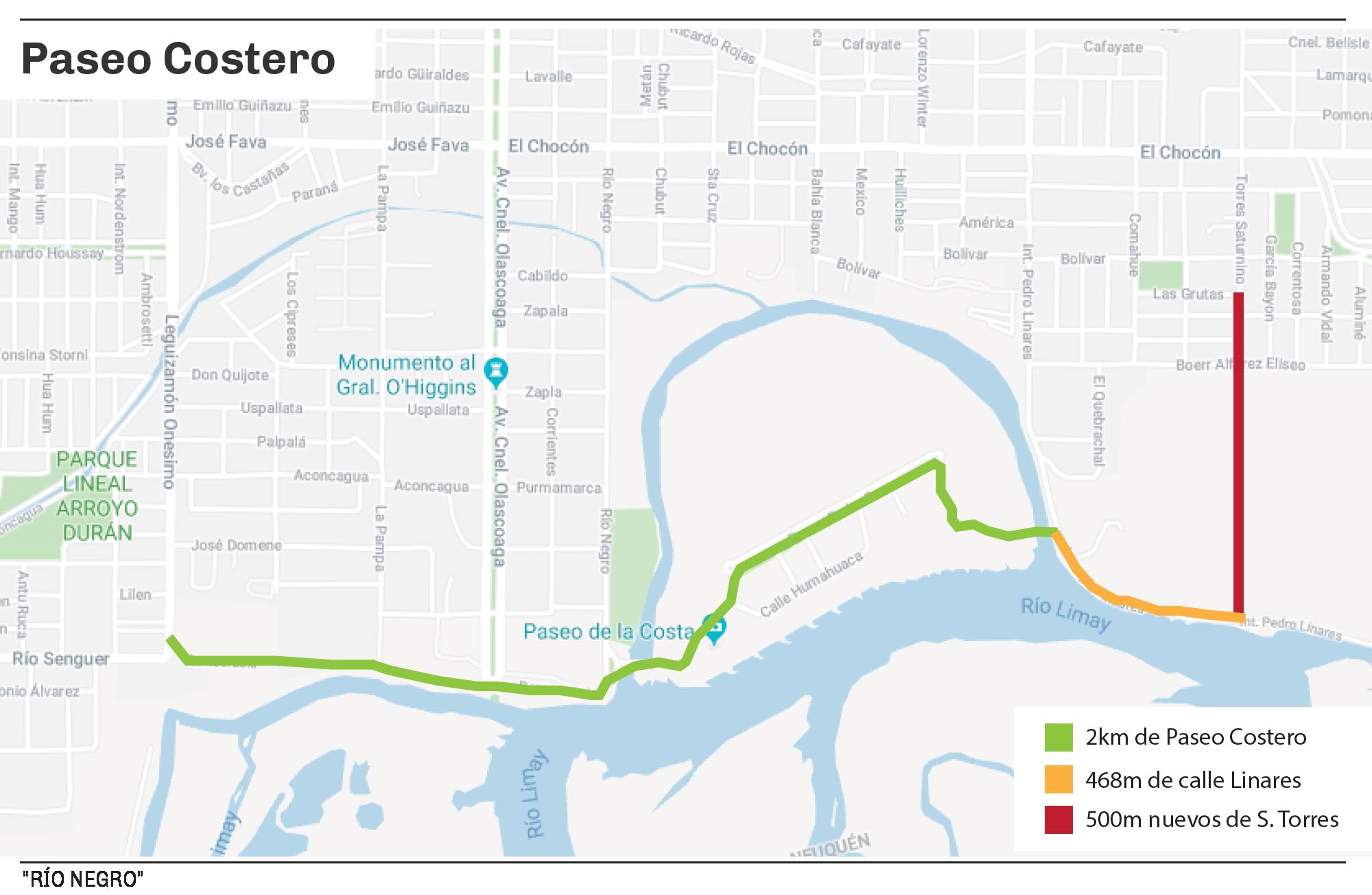 Además sumaran 450 metros aproximadamente de paseo costero que unirá esa calle con el puente de Linares que ingresa a la isla 132. Las obras están a cargo del municipio en conjunto con la Corporación para el Desarrollo Integral de Neuquén (Cordineu). Los trabajos que se van a realizar son asfalto con cordón cuneta, una red pluvial, una troncal de agua y otra de cloaca.