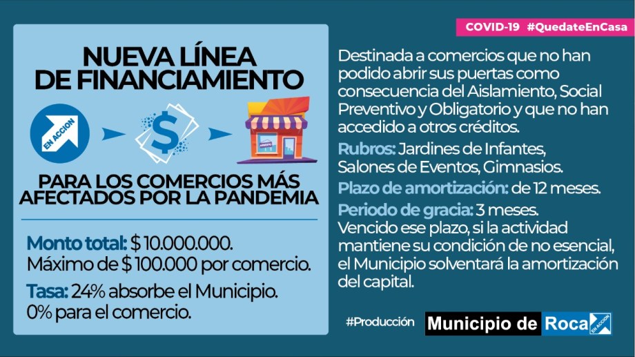 La ordenanza define la creación de un fondo que tiene por objetivo asistir a aquellos comercios de rubros no esenciales que aún no hayan reanudado sus actividades. El monto total disponible es de 10 millones de pesos, a una tasa del 24 por ciento anual, que será bonificada por el municipio local.
