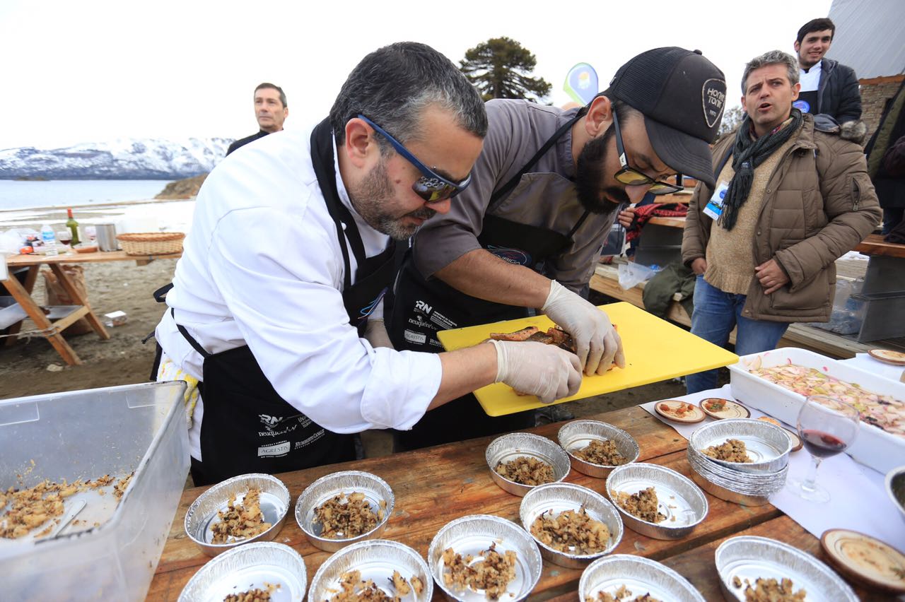 La acción comenzó el domingo 20 al mediodía en la Bodega Agrestis, en las afueras de Roca. Sol de invierno, viñedos y exquisiteces en el parque, a cargo de Federico Domínguez Fontan, Gaby Martínez, Jerónimo Romero, María Seleme y asistentes de la Universidad del Comahue y de la Escuela de Gastronomía y Hotelería de Bariloche. “Una combinación de sabores de la cordillera, el mar y el Valle”, explicó Fontán, chef ejecutivo del Llao Llao mientras los invitados probaban la tabla de ahumados regados con los vinos del anfitrión. Entre otras maravillas, salame de ciervo con snack de manzana deshidratada al romero, terrina de queso y trucha y salame de jabalí.