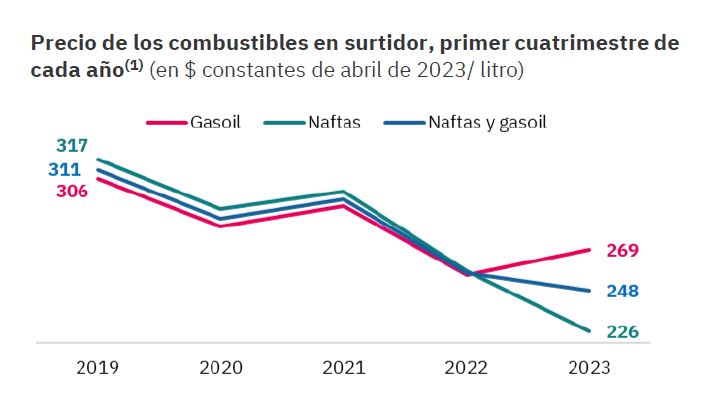 Tal como lo indica el gráfico, y tomando como base el precio por litro de los combustibles en pesos constantes en abril de este año, se lo siguiente: las naftas en $226, el gasoil en $269 y, el promedio de ambos da $248.
