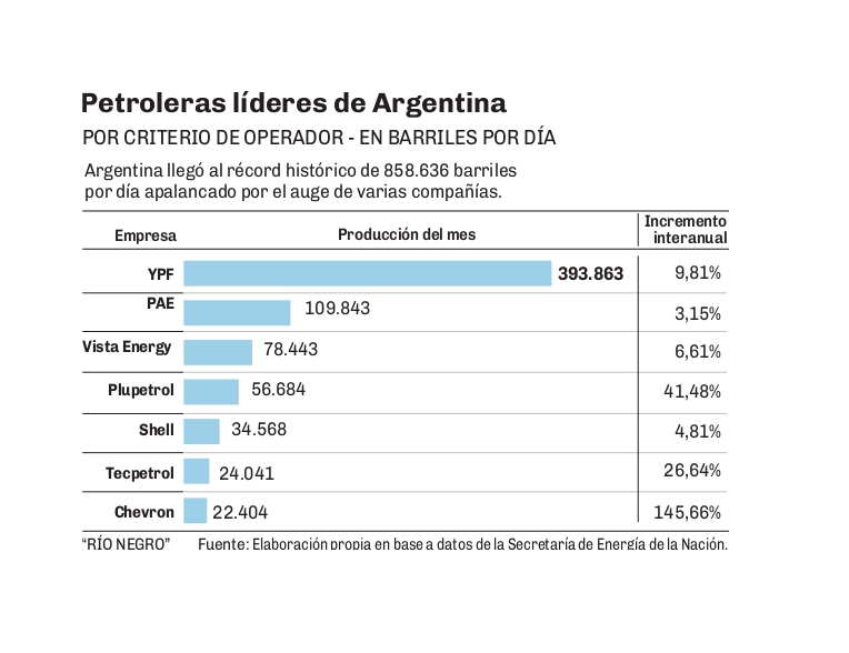 La firma que más producción obtuvo en este mes del récord histórico fue YPF. La petrolera de bandera extrajo un total de 393.863 barriles por día, el 45,87% del total de la producción del país, es decir casi la mitad de los barriles obtenidos.