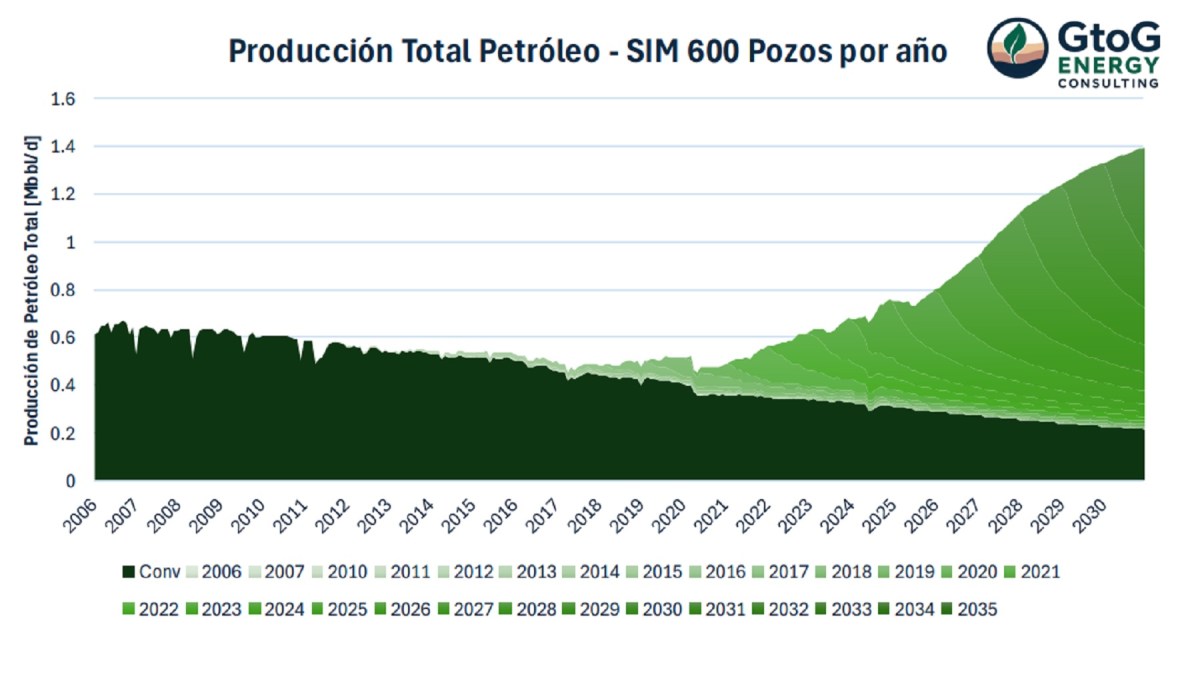 De acuerdo a las proyecciones de GtoG, para alcanzar la meta del millón de barriles diarios será necesario perforar entre 400 y 420 pozos por año de manera sostenida. Es un número que se está alcanzando en 2025 -con más de 400 pozos en marcha- y donde el verdadero desafío será mantener ese nivel de actividad durante al menos los próximos cinco años.