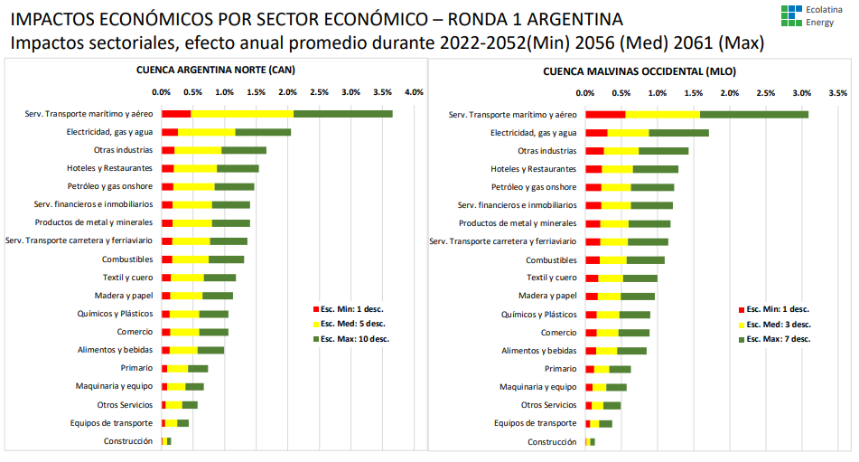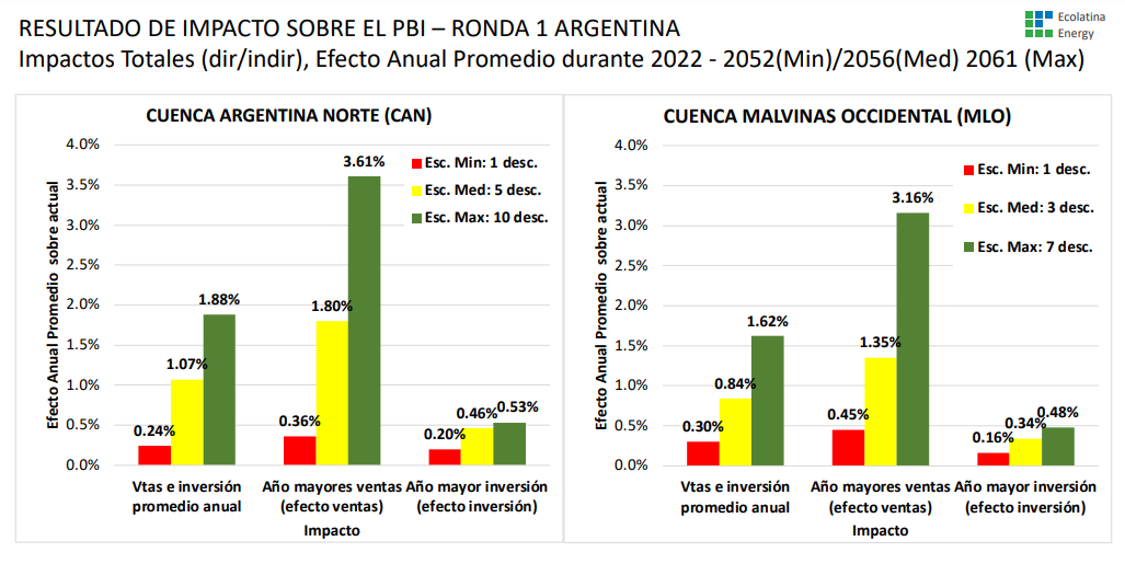 La consultora Ecolatina realizó un estudio para determinar el potencial impacto económico en caso de producirse nuevos descubrimientos offshore. La misma destacó que las Cuencas Argentina Norte (CAN) y Malvinas Oeste (MLO) podrían tener un aporte capaz de alcanzar el 3,6% y 3,16% del Producto Bruto Interno en los años de mayores ventas respectivamente.